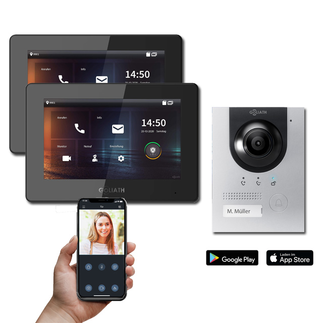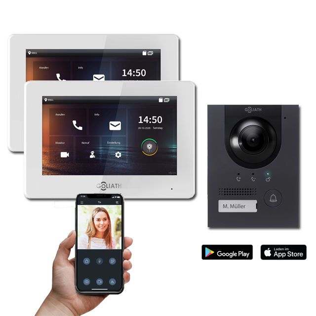 Ein weiterer Vorteil ist das ebenfalls integrierte Mikrofon. Folglich ist eine Kommunikation mit Besuchern vor der Tür ebenfalls möglich. Außerdem verfügt die Goliath Türsprechanlage über eine Handy App. Gleichfalls verfügbar für Android und iOS. Während Sie noch unterwegs sind, können Sie mit Besuchern vor der Tür kommunizieren. Zusätzlich können Sie die Tür manuell über die Innenstation, oder über die Handy App öffnen.