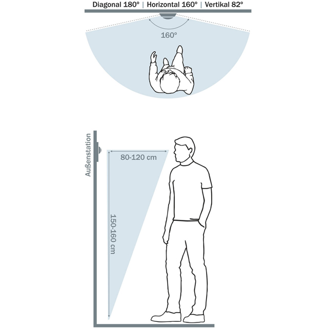| Bildwinkel | Diagonal 180° / Horizontal 160° / Vertikal 82° | ||