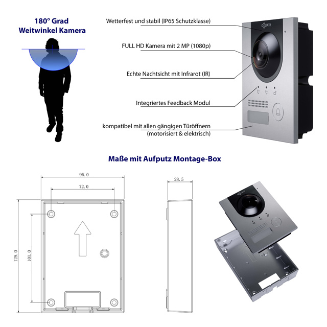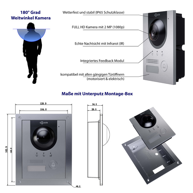 Durch den Staub- und Spritzwasserschutz der Goliath IP Türsprechanlage ist die Aussenstation daher perfekt für den Ausseneinsatz geeignet. Ebenfalls ist sie für den Einsatz in stark gefährdeten Bereichen gleichfalls geeignet. Ein weiterer Vorteil ist durch die vandalensichere Ausführung gegeben. Folglich wird sofort Alarm ausgelöst , sobald die Türstation entfernt wird. Außerdem können Sie die IP-Aussenstation gleichfalls als Auf- sowie als Unterputz montieren.