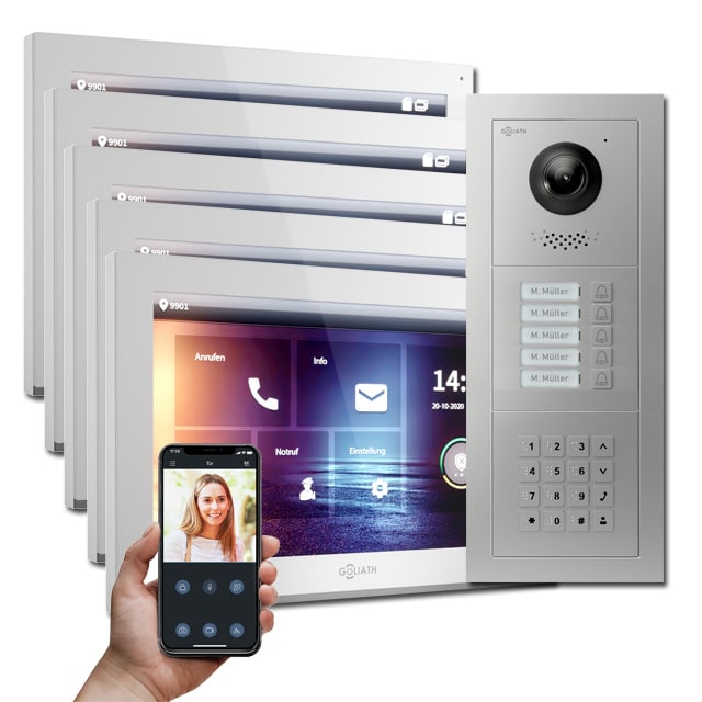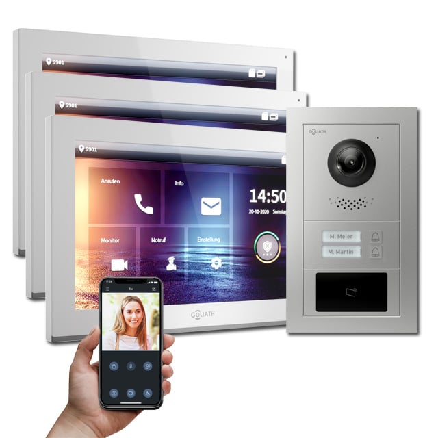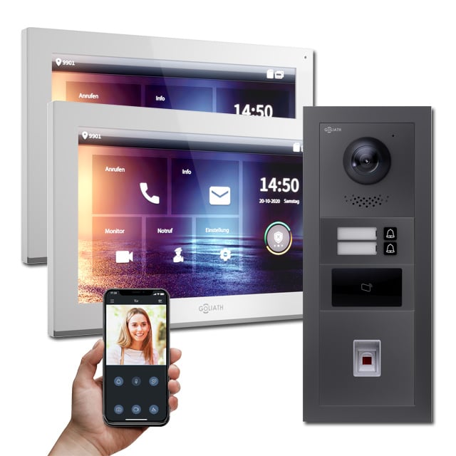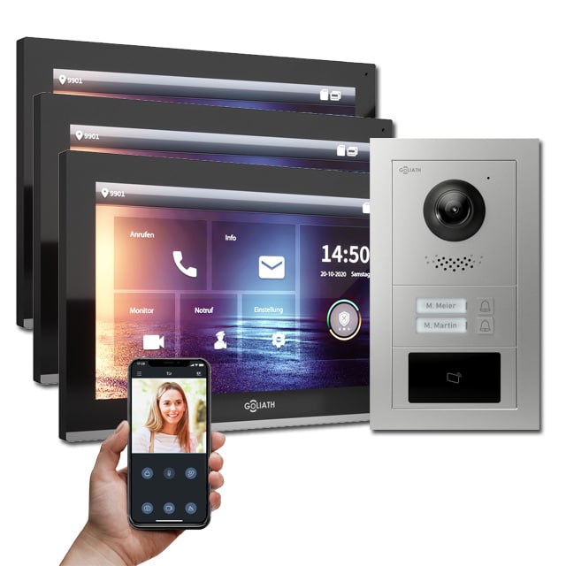 Ein weiterer Vorteil ist das ebenfalls integrierte Mikrofon. Folglich ist eine Kommunikation mit Besuchern vor der Tür ebenfalls möglich. Außerdem verfügt die Goliath Türsprechanlage über eine Handy App. Gleichfalls verfügbar für Android und iOS. Während Sie noch unterwegs sind, können Sie mit Besuchern vor der Tür kommunizieren. Zusätzlich können Sie die Tür manuell über die Innenstation, oder über die Handy App öffnen.